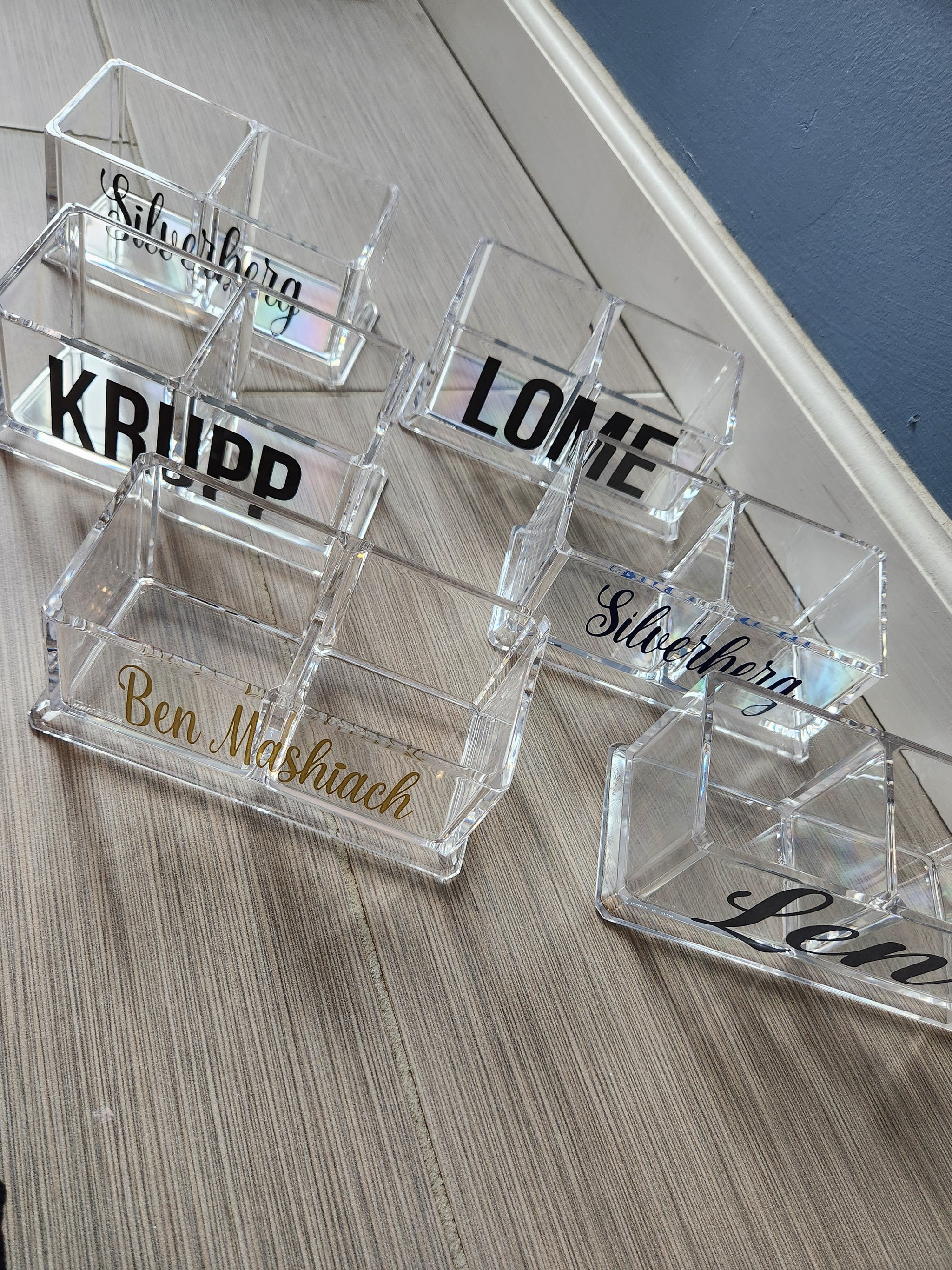 This lucite 2 compartment tea box makes the most thoughtful housewarming gift! Personalize with family's last name, monogram or initial to make it a one of a kind gift!