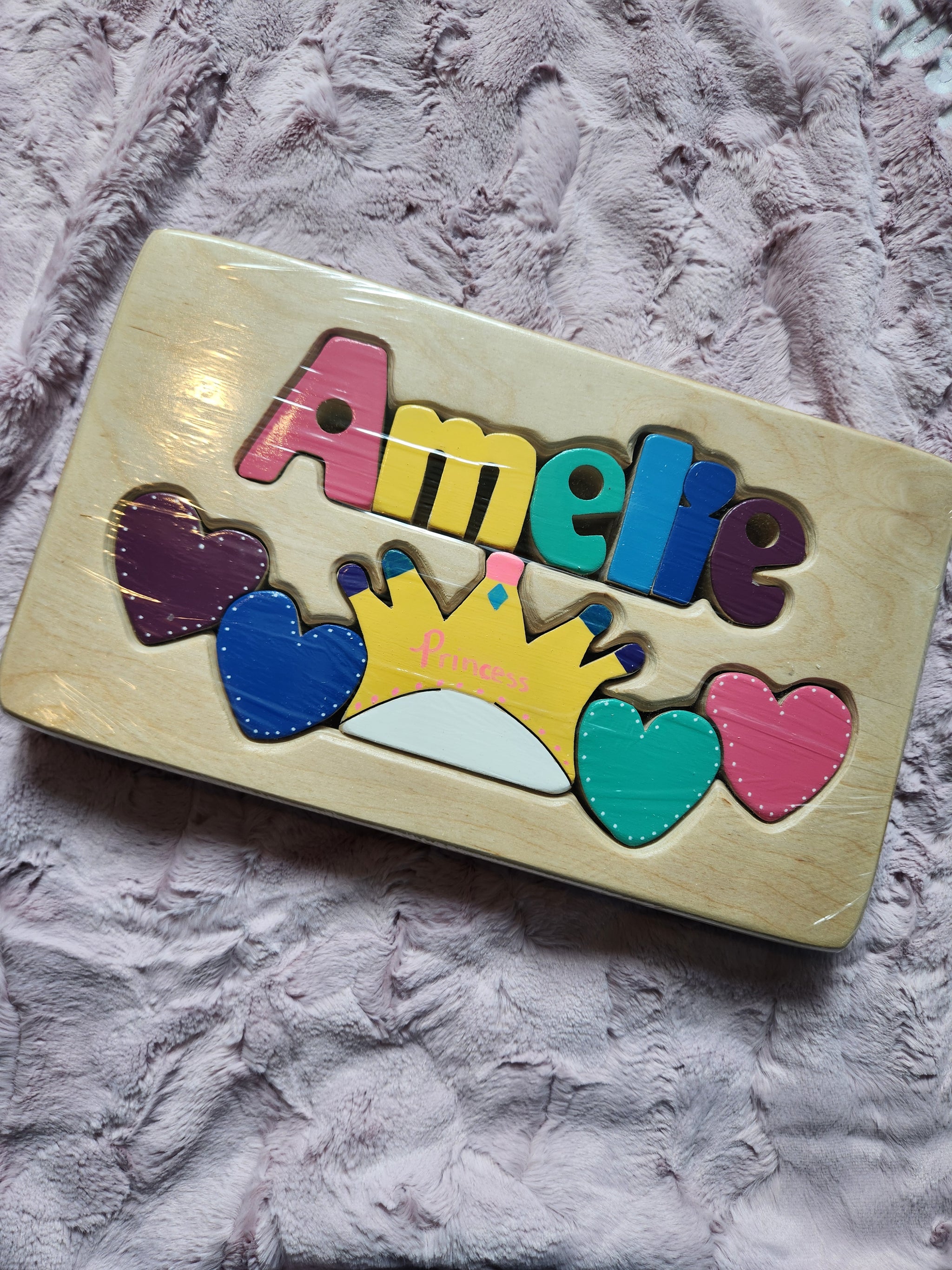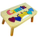 A new twist on our most popular name puzzle stool. For that "special" princess, childs name with a cute 5 piece crown and heart puzzle. Letters and puzzle painted in bright non-toxic paints. Shown in jewel colors. Upper case letters are 3 inches lower case 2 inches. One Name Only.