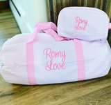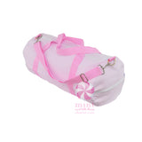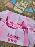 This pink seersucker duffle bag is a great size, made with a sturdy nylon fabric shell and lined inside. Comes with a shoulder strap for easier travel and a side zipper pocket