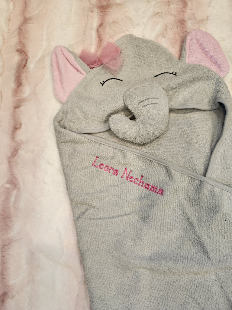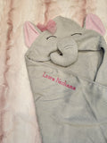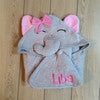 How adorable will your little one look in this super soft hooded towel? Add a name on the side for no extra cost! Towel measures 33 x 33 in, 100% cotton and machine washable.