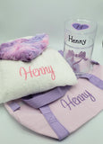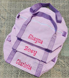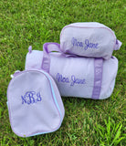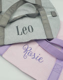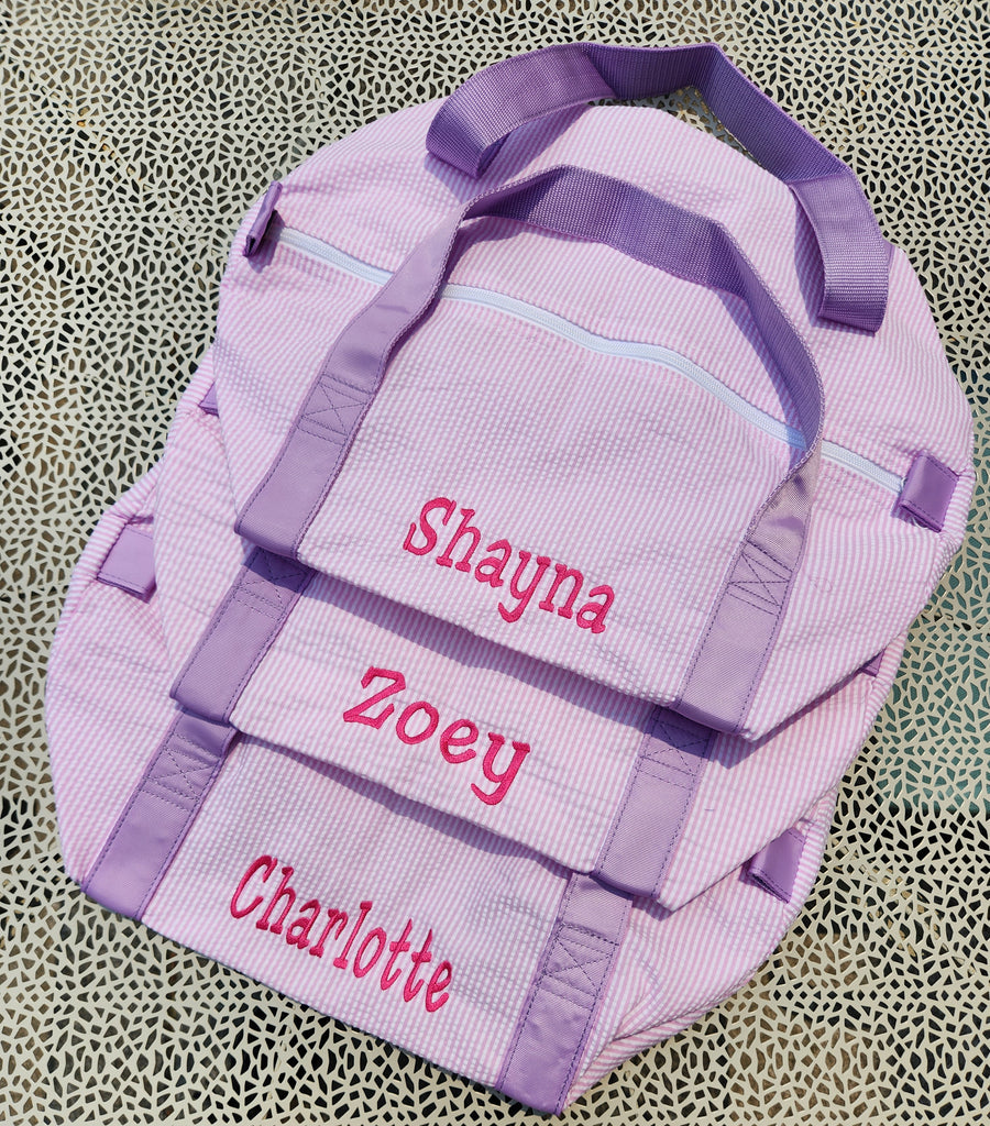 This pink and purple seersucker kids duffle bag is a great size, made with a sturdy nylon fabric shell and lined inside. Bag measures 18 inches by 9.5 inches. Can be personalized in English, Hebrew or a Monogram.