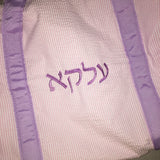 This pink and purple seersucker kids toiletry bag is a great size, made with a sturdy nylon fabric shell and lined inside. Can be personalized in English, Hebrew or a Monogram.