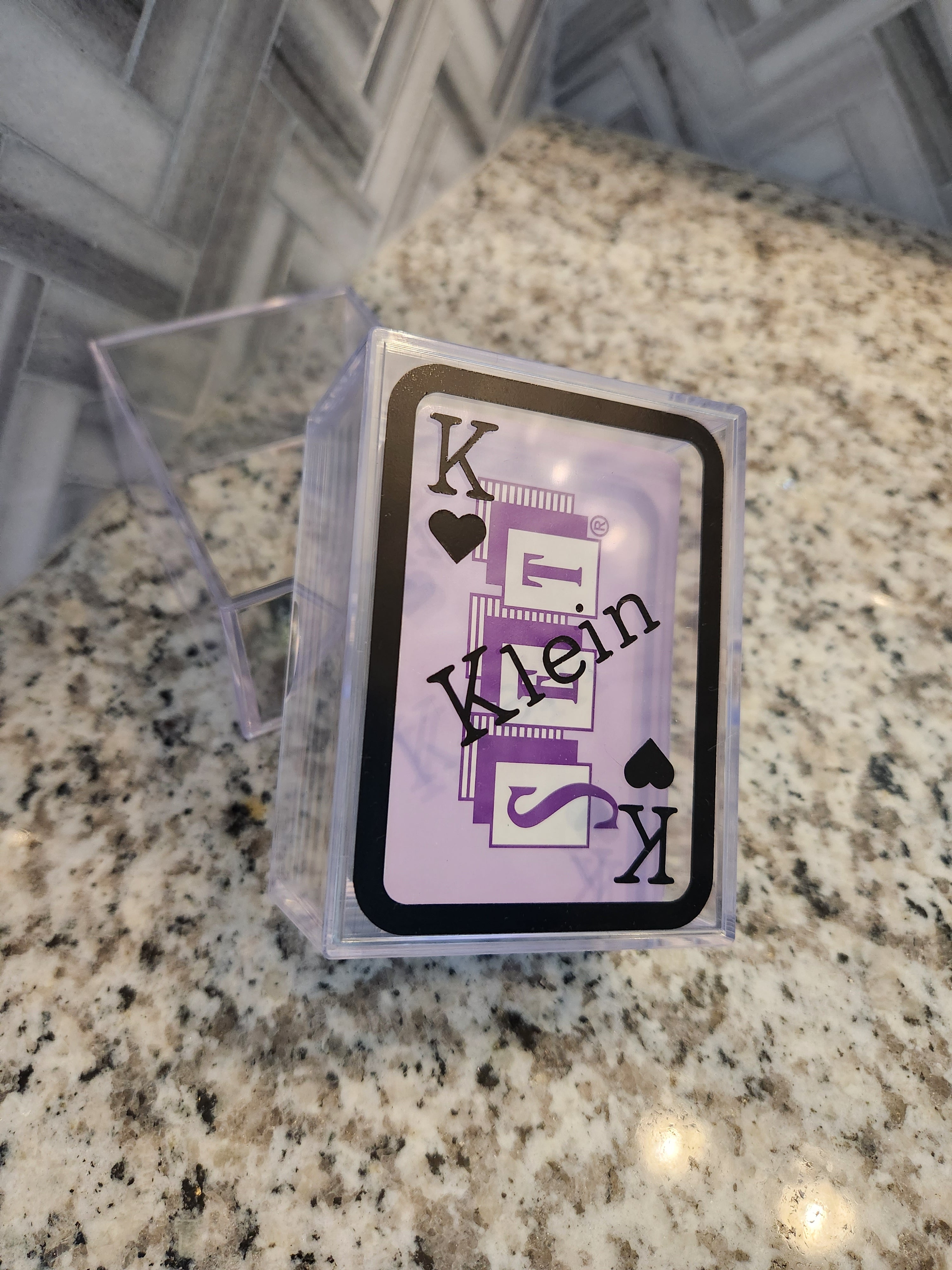 Keep those playing card in one place with this stylish lucite card box. Design it anyway you'd like!