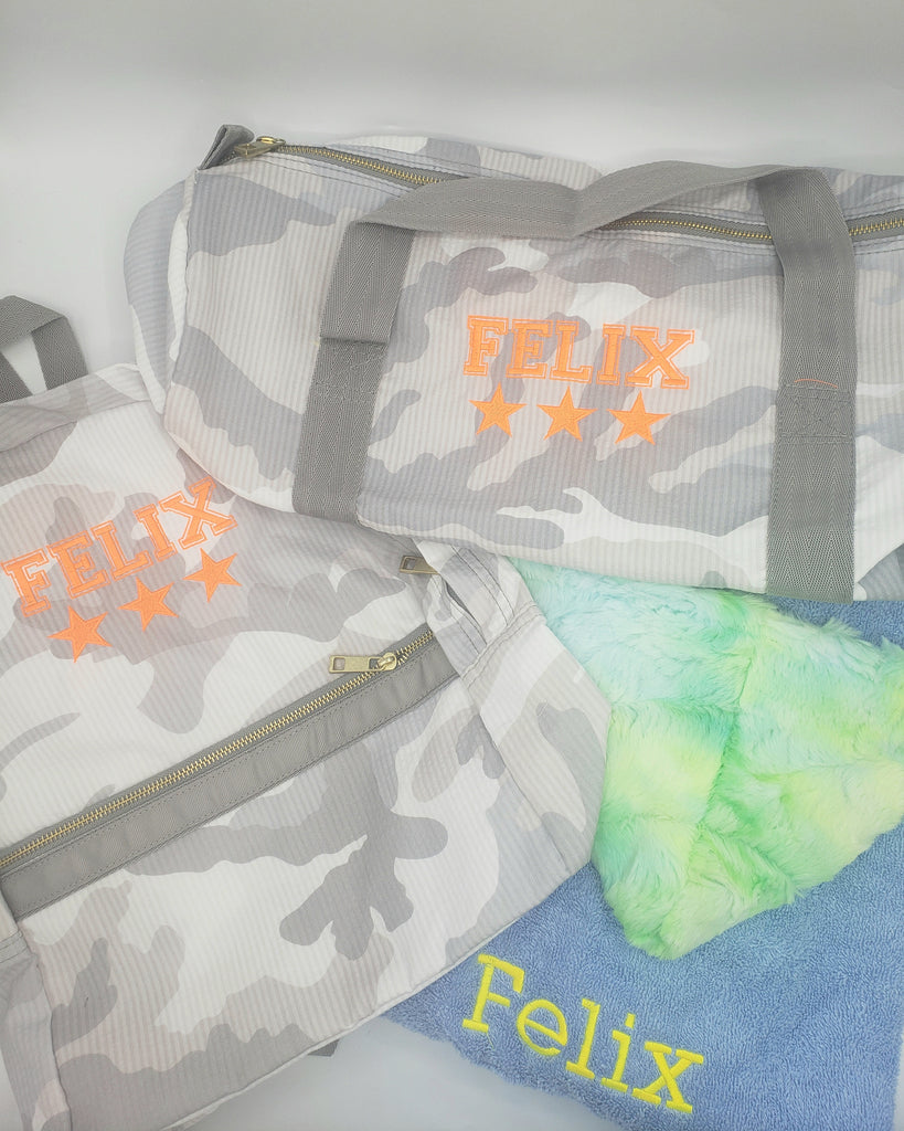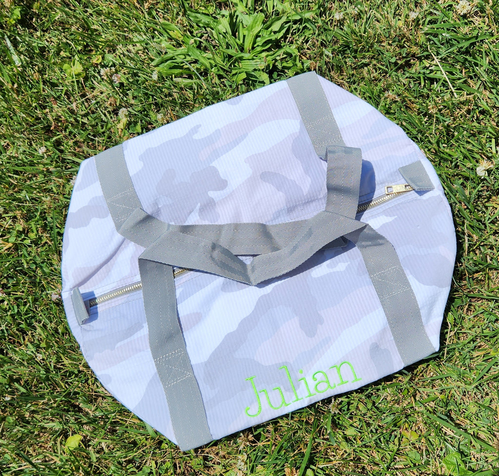 This gray camo kids duffle bag is a great size, made with a sturdy nylon fabric shell and lined inside. Comes with a shoulder strap for easier travel and a side zipper pocket