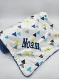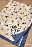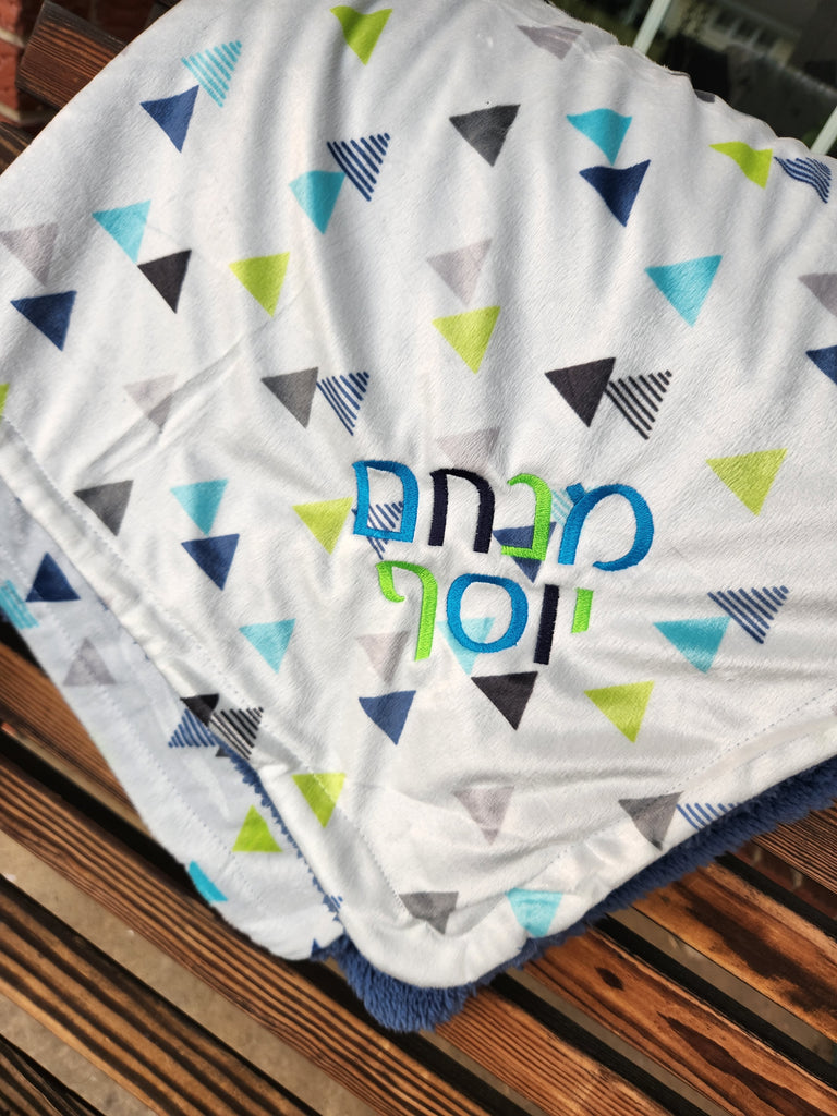 Super soft fleece blanket with colorful triangles on the back! Name is included. Personalize in English or Hebrew.