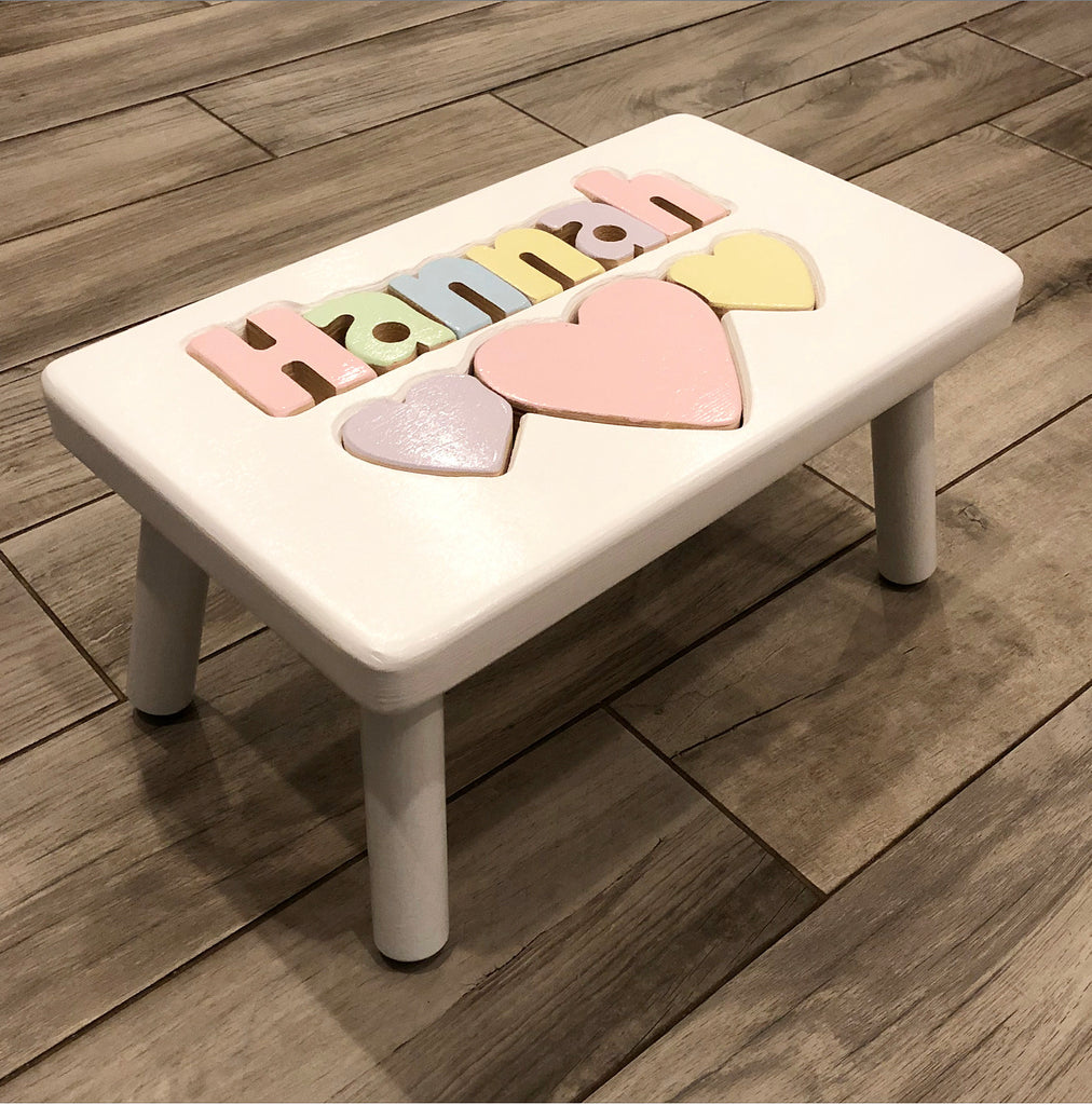 Each stool is handcrafted and painted in either bright primary, jewel or pastel colors Please allow a little extra time for shipping when ordering white stools. Single name only. Upper case letters 3 1/2 inches lower case 21/2 inches.